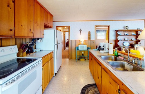 The living room features plentiful seating, a TV, and glass doors that lead outside to the lakefront deck. Moving into the country kitchen, you'll find ample cabinet storage, a dining room table for your guests, and an additional breakfast table in the lakefront sunroom that's shared with the washer/dryer. A gas grill, a picnic table, and a firepit await outside for summer days and nights spent at the water's edge.