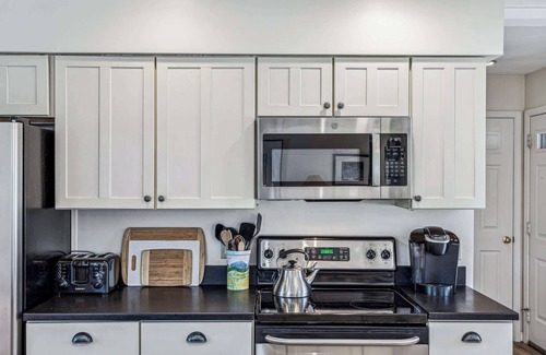 The kitchen and dining area are thoughtfully designed for both convenience and comfort. The fully equipped kitchen boasts all stainless steel appliances, a Keurig machine, toaster, blender, and tea kettle. It comes well-stocked with all cookware and cooking utensils, ensuring you have everything you need to prepare delicious meals. The kitchen also features ample counter space on the island, complete with a breakfast bar and seating for three. Adjacent to the kitchen, the separate dining area includes a table with seating for six, providing a perfect spot for enjoying meals together.