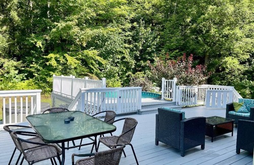 Enjoy Stowe in this bright and airy home conveniently located just one mile above the village with with a heated pool and hot tub! With five newly appointed and comfortable bedrooms, this private getaway is perfect for families. Full access to a complete eat-in kitchen, laundry, dining, and TWO living room areas, this is a great ‘home away from home’ experience. Large deck and mountain views await. This Stowe home is the perfect place for your mountainous vacation!